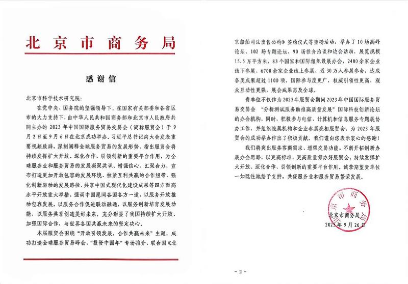 近日,我院收到北京市商务局发来的感谢信。信中指出,北科院不仅作为2023年中国国际服务贸易交易会“分析测试服务助推高质量发展”国际科技创新论坛的办会机构,同时,积极参与电信、计算机和信息服务专题展协办工作,并组织院属机构和企业参展亮相服贸会,为2023年服贸会的成功举办作出了积极贡献。同时,信中还表达了希望得到我院一如既往地支持,共促服务业和服务贸易繁荣发展的愿望。