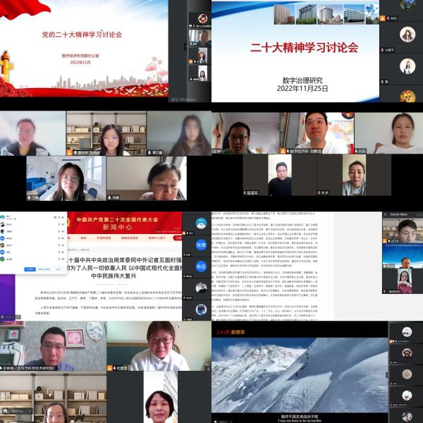 近期,北京市疫情防控形势严峻,数字经济所党支部在强化落实党员在疫情防控中发挥先锋模范作用的同时,继续深入推进党的二十大精神常态化学习。党支部采用线上线下相结合的形式,利用工作群、党员群及时转发党的二十大学习资料。各部门负责人围绕党的二十大报告并结合部门工作,在部门内组织开展学习研讨,所领导和全体党员、干部群众共同学习,谈收获、谈感受、谈想法,全面准确学习理解大会精神,确保将党的二十大精神融入到科研、管理工作中,以更加务实高效的工作作风,推进数字经济所高质量发展。
