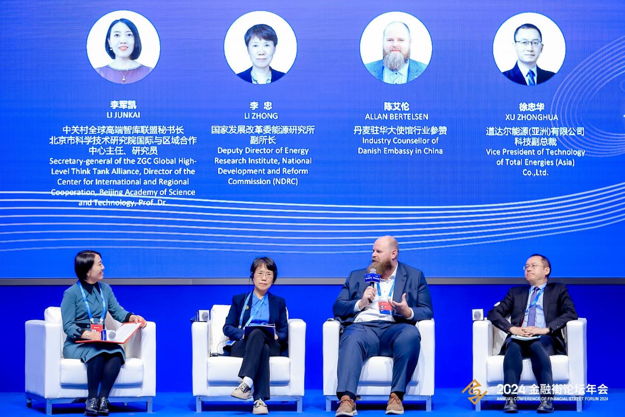 会上,李军凯与北京绿色金融与可持续发展研究院院长马骏、中欧绿色与创新产业协会理事长范豪毅、中国人民大学生态环境学院书记贾铁英共同参加绿色创新国际专家工作站启动仪式。该工作站旨在汇聚全球绿色创新专家智慧,共同推进全球绿色治理体系建设。在圆桌论坛主题三“推动中欧绿色能源的创新与合作”环节,李军凯作为主持人与国家发展改革委能源研究所副所长李忠、丹麦驻华大使馆行业参赞陈艾伦(Allan Bertelsen)以及道达尔能源(亚洲)有限公司科技副总裁徐忠华等专家围绕能源转型路径、技术创新、中欧绿色能源合作等议题展开交流探讨,专家们通过不同维度的分析,展现了中欧绿色能源合作的广阔前景和重要意义。