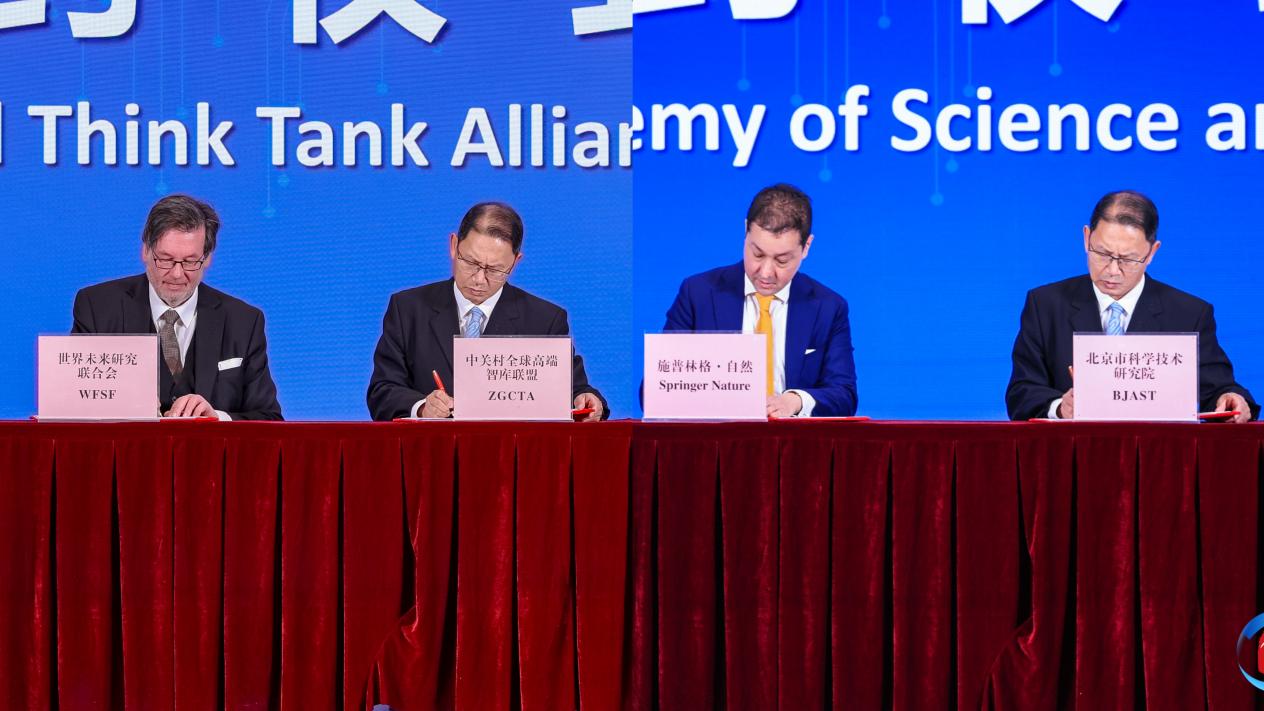 签约环节,举行中关村全球高端智库联盟签约仪式。2024年,来自中国、巴西、印度、意大利、日本、尼泊尔、塞尔维亚和西班牙8个国家的23家高端智库正式成为智库联盟理事单位。在新增智库联盟理事单位签约仪式上,14家理事单位代表出席仪式。未到场的理事单位也通过精心录制的祝福视频,表达了对加入智库联盟的喜悦以及对未来合作的期待。智库联盟现已发展成为16个国家95家联盟理事单位的民间多边交流合作平台,涵盖综合智库、科技智库、经济智库、行业智库、出版传媒智库、企业智库六种类型。智库联盟致力于推动跨国界、跨领域的深度合作,通过资源共享、优势互补和协同创新,与国际组织等机构实现互利共赢。在智库联盟国际与区域合作签约仪式上,智库联盟与世界未来研究联合会签署战略合作协议。同时,智库联盟理事长单位北科院与副理事长单位施普林格·自然就新书出版签署合作意向协议。智库联盟理事长、北科院院长伍建民,埃里克·F·奥弗兰德先生,施普林格·自然大中华区总裁安诺杰(Arnout Jacobs)等代表出席签约仪式。