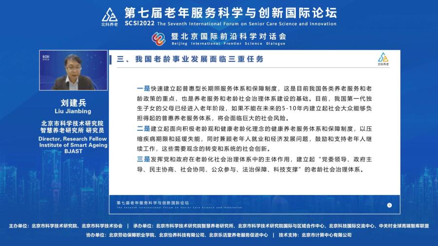 刘建兵在报告中提出,我国老龄工作面临建立三重任务:即需要快速建立起普惠型的长期照服务体系、面向积极老龄观和健康老龄化理念的健康养老服务体系和老龄社会治理体系,三个体系形成一个递进和包含关系,共同构成我国当前老龄工作面临三重任务,需要同步建设和完善。在此基础上,基于北京的实际情况,提出了三个体系建设需要突破的重点问题和任务。在保障措施方面,提出了要加强顶层设计和制度建设,建立全市统一的老龄保障制度和政策;建立动态的老龄人口管理制度和数据库;建立面向老龄社会治理的科技支撑体系,加大研发投入力度;提高养老服务人员社会和经济地位,建立多次人才教育和培训体系。