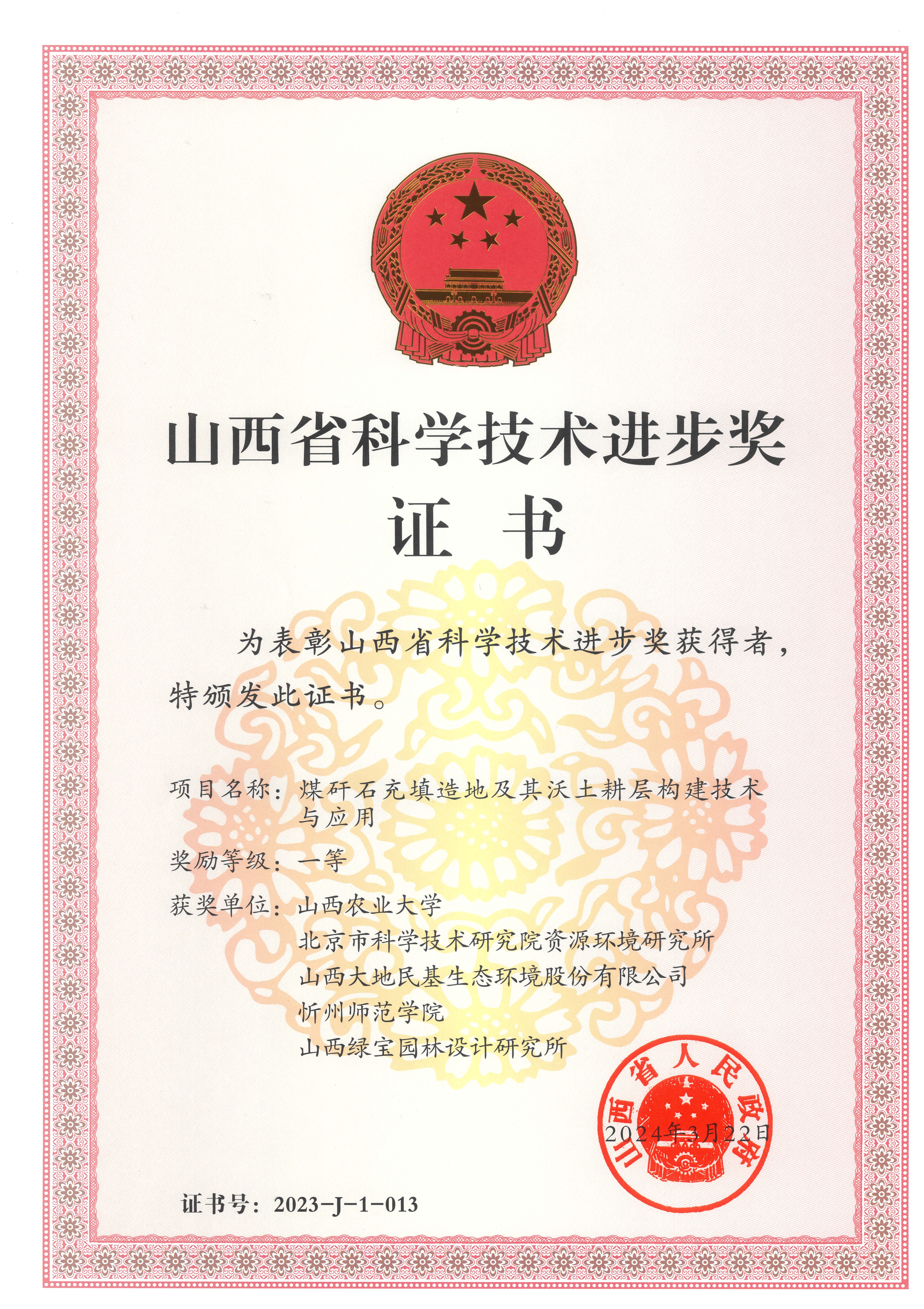 根据《山西省人民政府关于2023年度山西省科学技术奖励的决定》(晋政函[2024]44号),幸运彩资源环境研究所(以下简称“资环所”)作为第二完成单位申报的《煤矸石充填造地及其沃土耕层构建技术与应用》项目荣获2023年度山西省科学技术进步一等奖,资环所张成梁、姚晶晶排名分别为第2和第5。项目牵头单位为山西农业大学,其他完成单位包括山西大地民基生态环境股份有限公司、忻州师范学院和山西绿宝园林设计研究所。