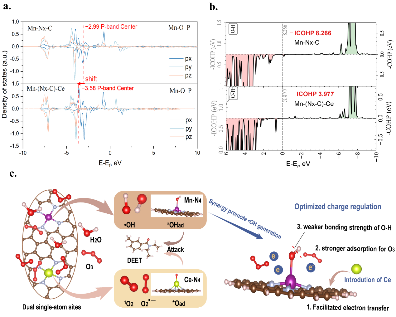 为了解决上述问题,研究团队基于原子分散的单原子催化剂(SACs)金属利用率高、催化活性好、结构稳定的特性,开发了具有双活性位点的双单原子Mn-(Nx-C)-Ce催化剂,Mn和Ce均以单原子的形式存在且其配位环境分别为Mn-N4和Ce-N4(图2),原子分散的活性Mn-N4和Ce-N4位点协同促进了•OH的生成。这主要是因为Mn-(Nx-C)-Ce中优化的电荷调节促进了Mn-(Nx-C)-Ce中的电子转移,增强了Mn-N4-OH对O3的吸附,削弱了Mn-N4-OH中O-H的结合强度(图3)。