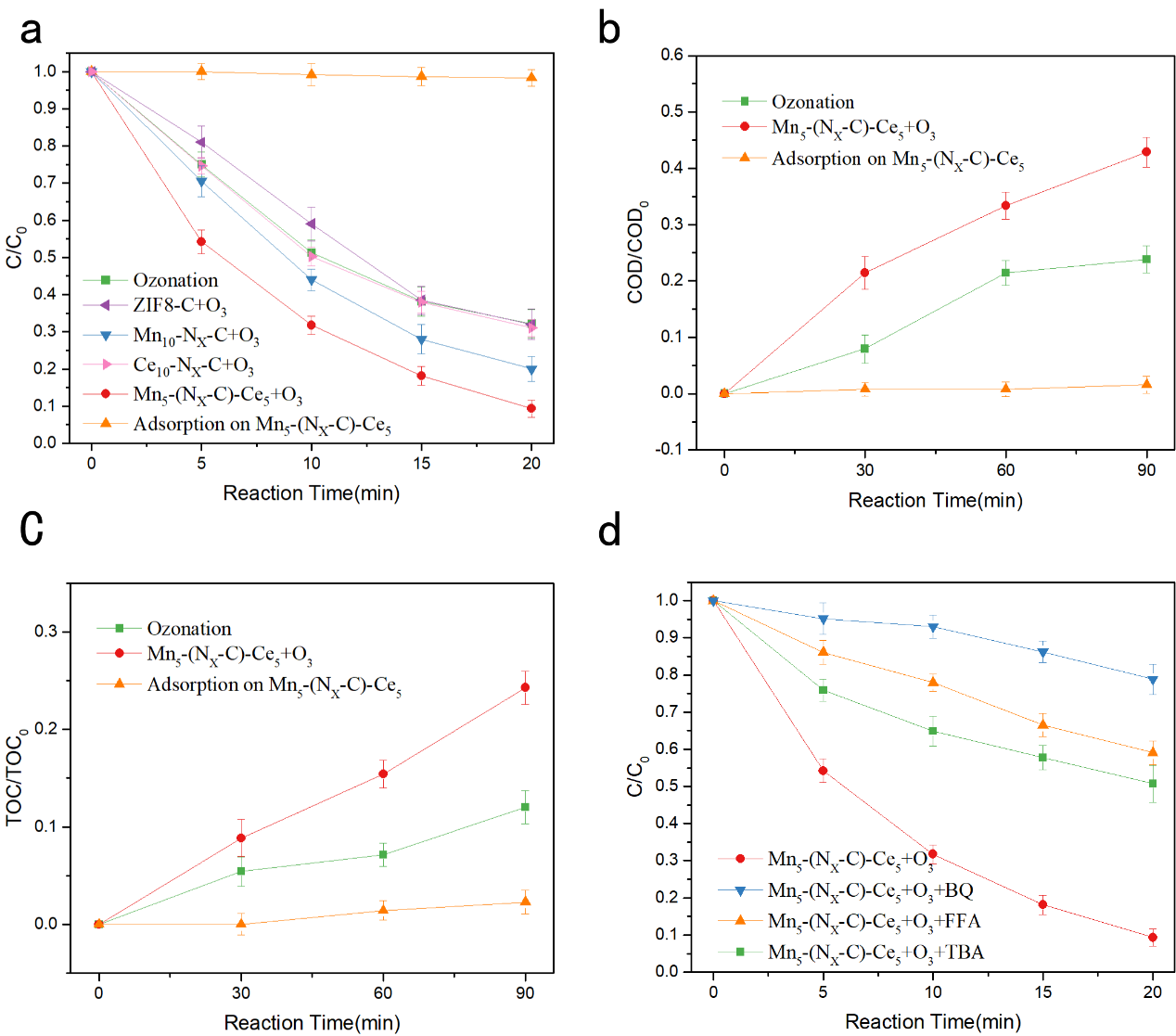 图4 .DEET在不同系统中的降解(a),不同系统中焦化废水的深度处理(b,c),Mn5-(Nx-C)-Ce₅/O₃系统中DEET降解的淬灭试验(d)