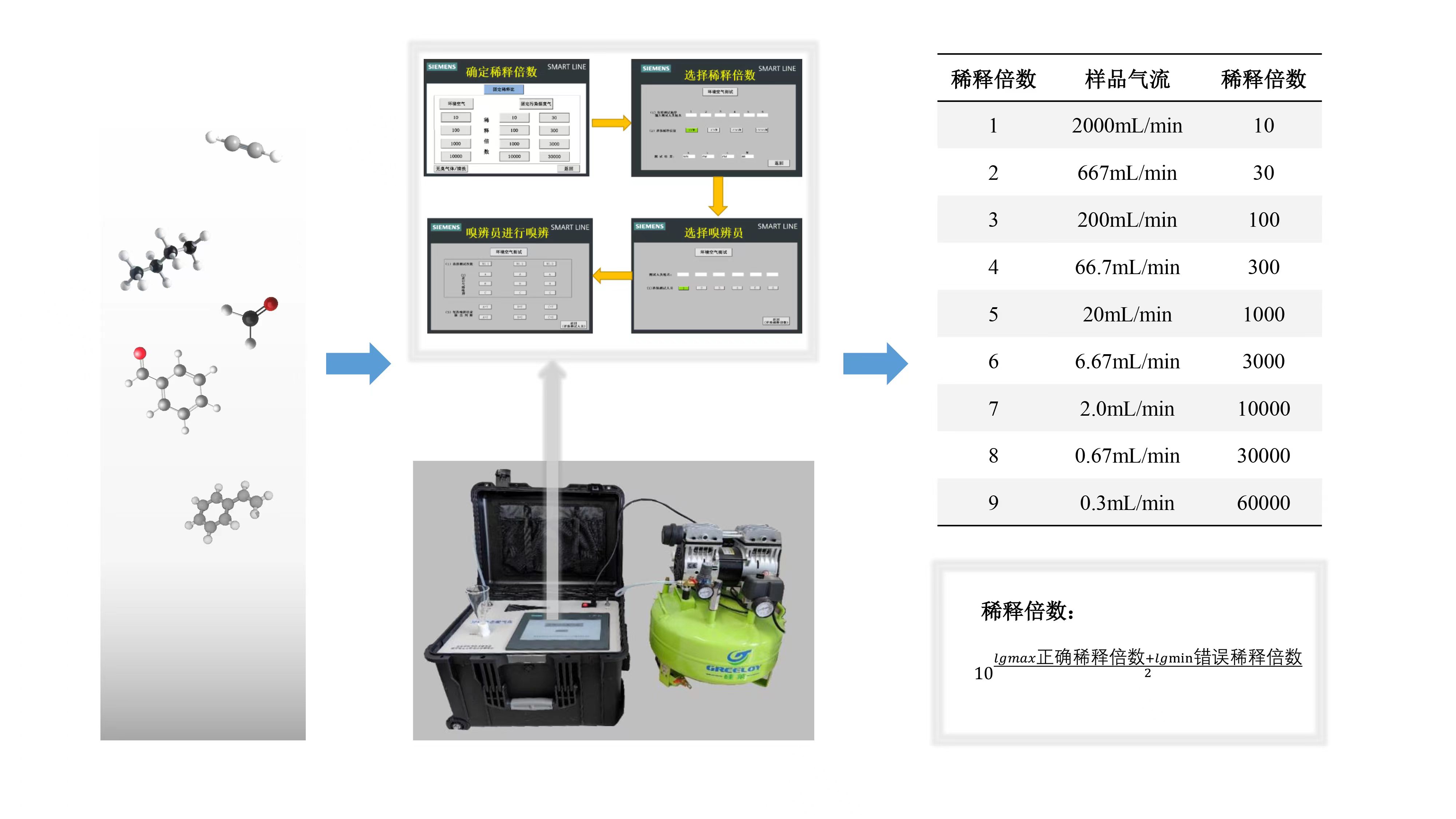 团队研制出的高精度高比例稀释异味动态配气系统,流量控制准确度范围为-2.91%至0.23%,优于±5.0%F.S.,流量控制重复性范围为0.14%至2.97%,优于5%,各稀释倍数的准确性范围0.9%-11.6%,小于20%的标准限值,不稳定性0.9%-4.0%,小于5%的标准限值,均满足国际标准EN13725对于动态稀释仪的要求。
