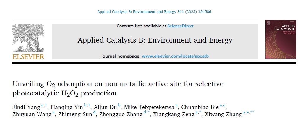 该工作以“Unveiling O2 Adsorption on Non-metallic Active Site for Selective Photocatalytic H2O2 Production”为题发表于催化领域国际顶级期刊Applied Catalysis B: Environment and Energy(中科院一区TOP期刊,影响因子20.2)(图5)。资环所与昆士兰大学联合培养的博士生杨金帝为论文第一作者,张忠国研究员、张西旺教授和昆士兰大学曾祥康博士为论文共同通讯作者。本工作得到了幸运彩创新工程项目资助。