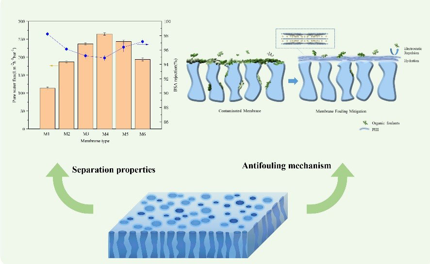 复合膜耐污染机理主要包括两个方面。一是复合膜中PHI富含含氧官能团(-COOH),将有机污染物限制在膜孔表面而不进入膜孔内部,且静电排斥降低了有机物在膜表面的粘附;二是PHI构筑了亲水性的表面,让水能够通过膜内孔隙,并在表面形成水合层,阻止污染物和复合膜的接触,提高了复合膜的防污性能(图4)。