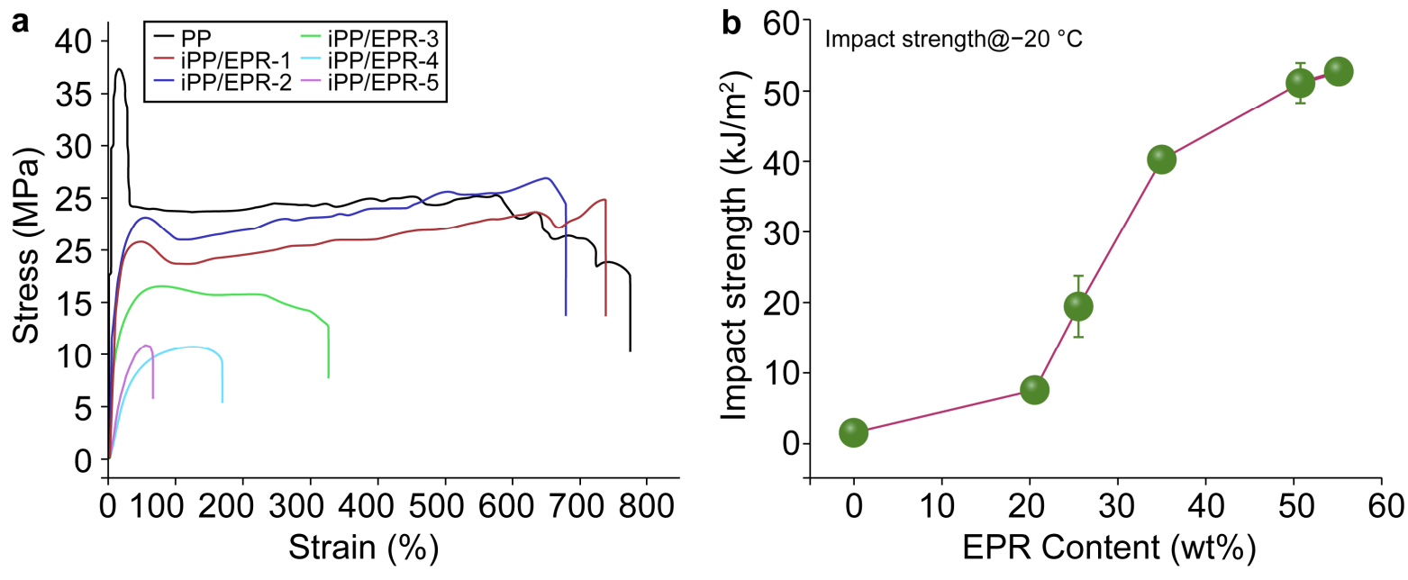 图5.聚丙烯和支化交联聚丙烯多相共聚物的力学应力-应变和低温抗冲击强度(T = −20 ℃)变化曲线