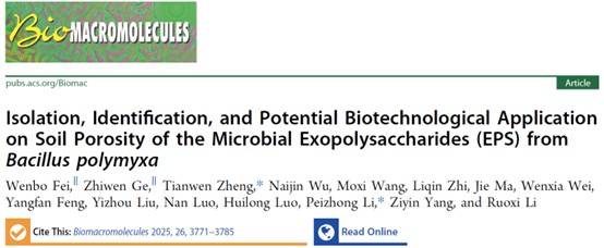 本工作以“Isolation, Identification, and Potential Biotechnological Application on Soil Porosity of the Microbial Exopolysaccharides (EPS) from Bacillus polymyxa”为题发表于Biomacromolecules期刊(中科院期刊分区一区Top期刊,影响因子5.5),如图4所示。资环所客座研究生费文博为本论文的第一作者,郑天文博士和李培中研究员为论文共同通讯作者。本研究工作得到了北科院创新工程项目(No. 11000024T000002830698)资助。下一阶段,该团队将继续开展该生物强化阻控材料在相关污染场地中污染物的阻控与降解应用研究。