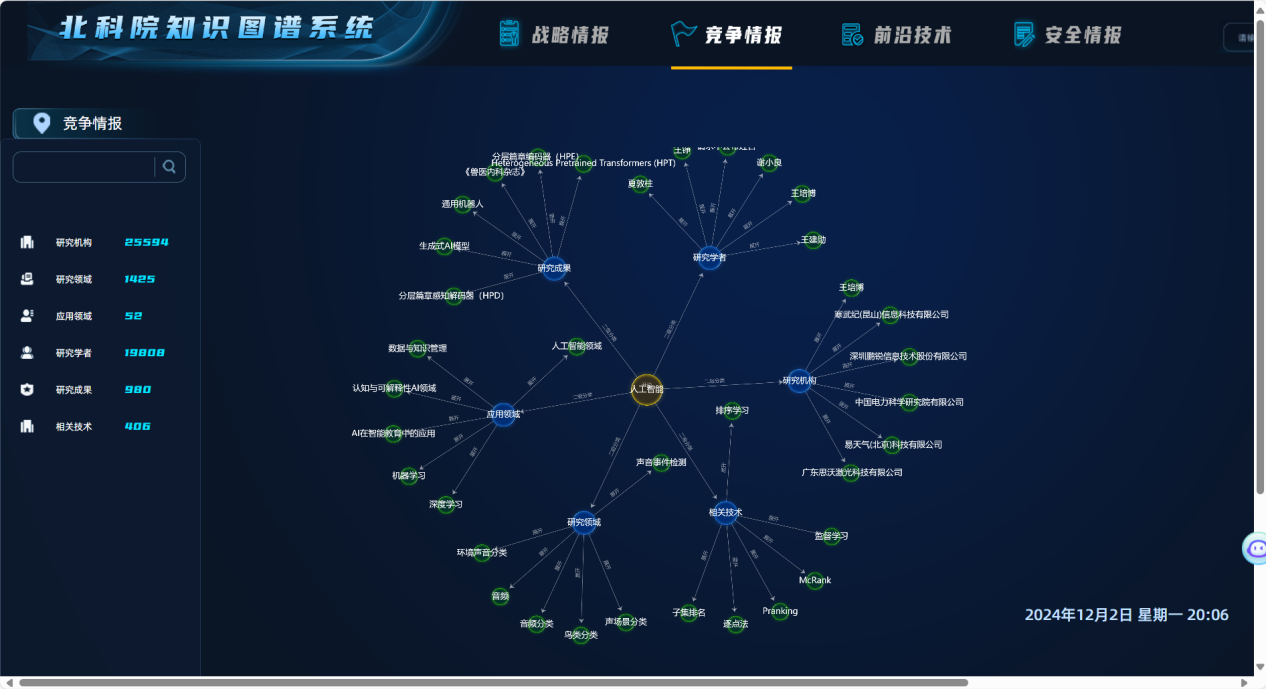 在知识图谱与大模型融合方面,研究团队构建科技情报领域知识图谱,实现了多源异构知识的融合与推理,并通过知识图谱与大模型的融合,促进了大模型输出的准确性和可靠性,便于情报研判和洞察。基于大模型知识图谱自动构建技术,解决非结构化的情报信息结构化处理问题,为后续情报分析奠定基础。基于知识图谱的检索增强技术,为提高大模型输出的准确性提供了可选路径。