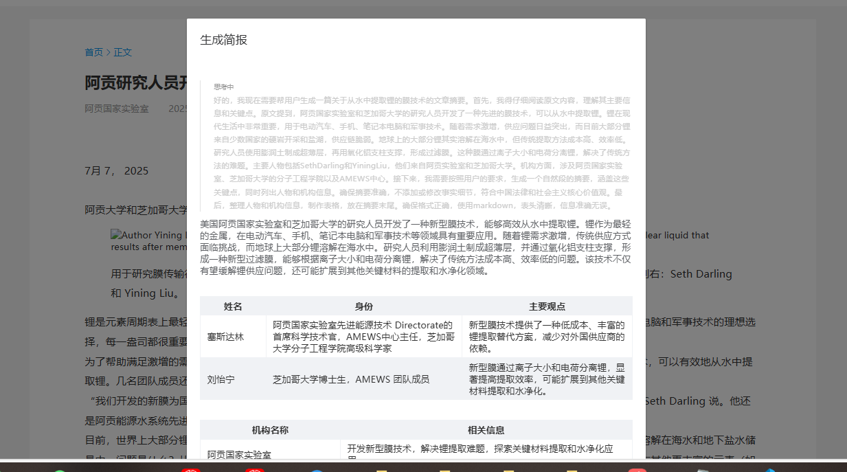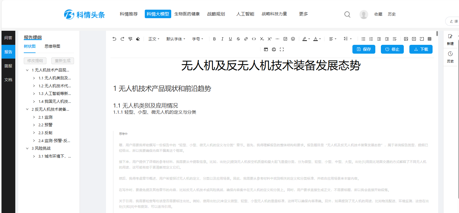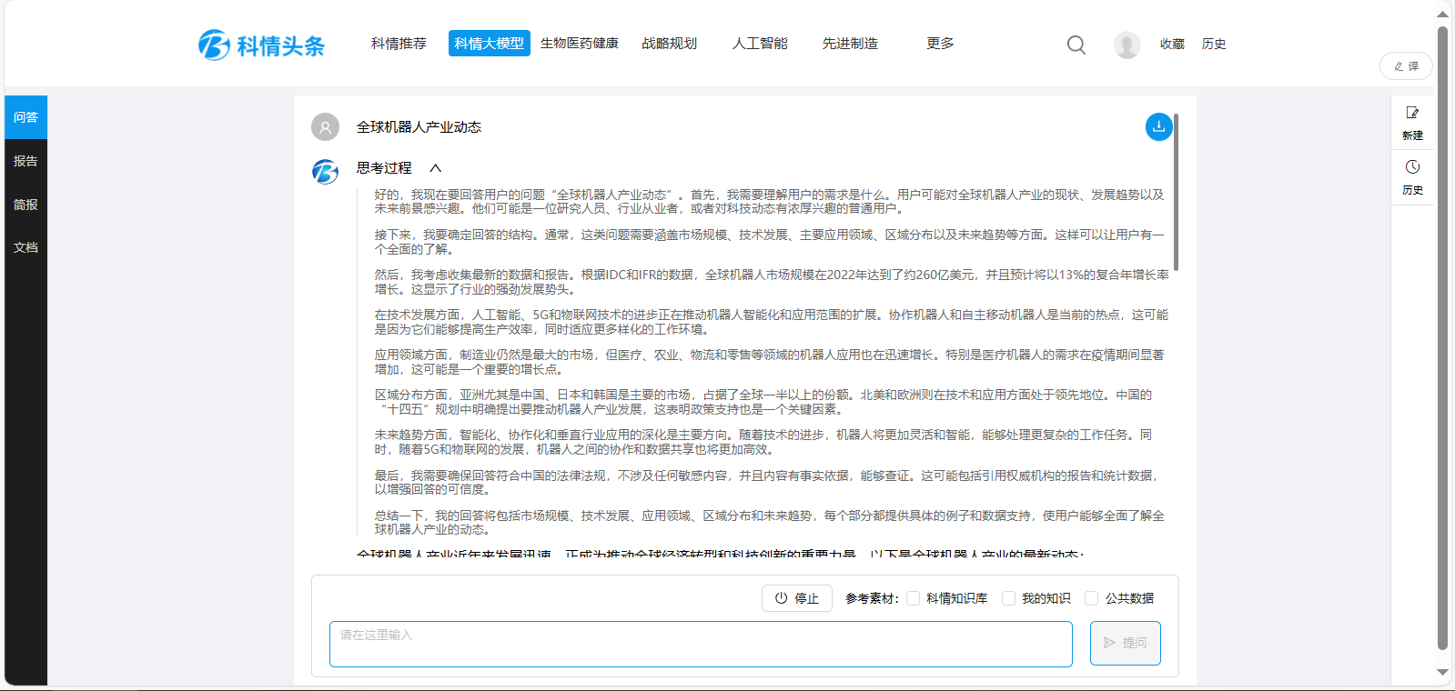 研究团队结合现有情报系统,在科技情报领域建成全国首个以科技动态为特点的大模型服务平台,完成基于科技情报大模型的情报智能问答、智能简报、研究报告辅助撰写等智能化情报服务功能,实现对话式情报服务、自动摘要以及情报报告辅助撰写,优化个性化推荐功能,并且实现线上线下情报智能获取与处理,拓展情报获取的渠道与范围,提升现有情报服务平台的感知能力。