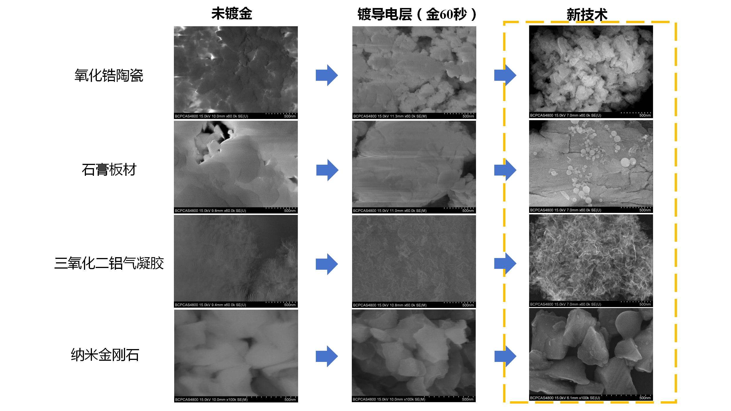为系统验证新技术的可靠性与稳定性,研究人员选取对荷电效应更为敏感的冷场发射扫描电镜,以氧化锆、石膏、三氧化二铝气凝胶、纳米金刚石四种典型绝缘材料为实验样本,在500纳米尺度下,将新技术与传统方法进行成像效果比对。结果证实,新技术在成像的空间分辨力、信噪比、成像衬度以及纳米尺度的成像稳定性等关键指标方面均表现优异,能够更真实地还原材料的微观结构与尺寸信息(见图1、图2)。