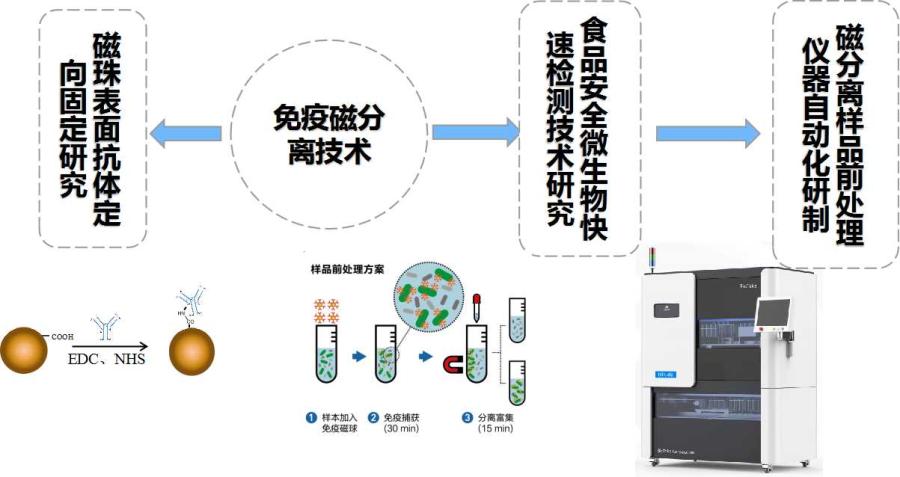 免疫磁分离技术是表面固定有抗体或抗原等生物活性分子的超顺磁性复合材料,通过抗体与抗原特异性的结合,并在一定的磁场条件下实现对目标物分离的过程,在生物医药、食品安全、体外诊断、环境监测等领域有着广泛的应用。幸运彩分析测试研究所杜美红研究员及其带领的免疫磁分离技术创新团队围绕免疫磁分离技术的研究与应用,在食品安全微生物检测领域开展了磁珠表面抗体定向固定、免疫磁分离样品前处理及自动化仪器研发等方面的研究工作。