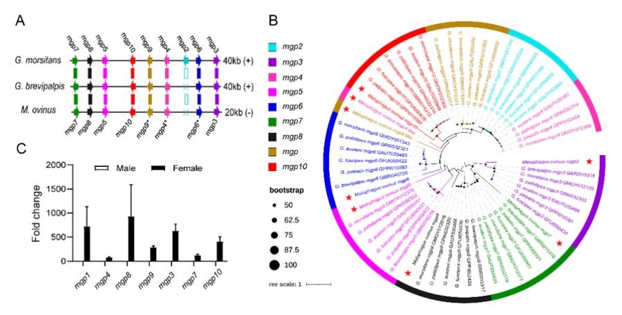 北京麋鹿生态实验中心与中国科学院动物研究所合作,首次测序、组装及注释了羊虱蝇的基因组信息,并且开展了羊虱蝇生物学特征相关的遗传学机制的研究。研究发现羊虱蝇基因组大小为188Mb,编码13,372个蛋白。系统发育分析表明,绵羊虱蝇与舌蝇的分化发生于7200万年前的白垩期晚期。同时,研究团队在羊虱蝇中注释出了一系列虱蝇总科昆虫特有且保守的乳蛋白支系的同源基因,即乳蛋白基因家族,这揭示了虱蝇独特的“腺养胎生”繁殖策略的遗传学机制,并且这种保守的繁殖方式为虱蝇总科昆虫提供了一种潜在的新型防治靶标。此外,羊虱蝇中感受器受体基因家族和视觉相关视紫红质基因基因家族显著的收缩和丢失,表明羊虱蝇具有更窄的生态位(高度宿主专一性和专性吸血)。这些遗传资源将为了解羊虱蝇的生物学基础和疾病控制策略提供新见解。