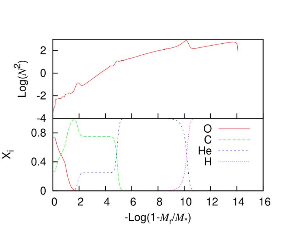 图2脉动白矮星从中心到外部大气的化学元素所占百分比的轮廓示意图