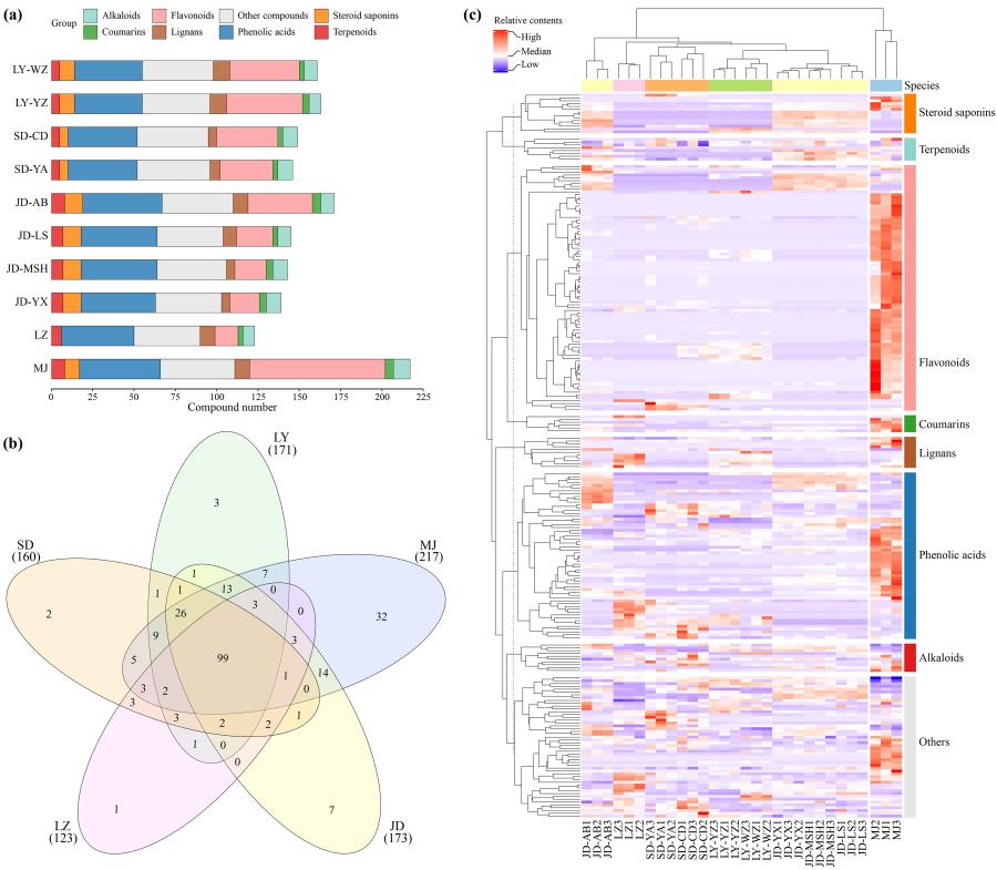 百合是我国传统的药食两用食材,富含多种营养成分,还有止咳平喘、预防老年痴呆等多种药用功效。多种百合的鳞茎可药食兼用,但影响其功效的关键成分还不清楚。为了挖掘药用百合中的关键物质,辐射技术研究所的研究人员收集了不同原产地的药用百合、食用百合和野生百合,基于超高效液相色谱-电喷雾串联质谱法分析不同百合中的次生代谢物。在检测到的245种次生代谢物中,创新性结合药用百合本草考证和多种分析方法进行代谢物筛选,发现药用百合中的关键成分为一种甾体皂苷(初步鉴定为26-O-吡喃葡萄糖-呋甾烷-5-3,26-二羟基-3-O-[吡喃鼠李糖基-(1→2)]-吡喃葡萄糖苷)。本研究明确了药用百合中的关键物质,研究成果以《Metabolome-Based Discrimination Analysis of Five Lilium Bulbs Associated with Differences in Secondary Metabolites》为题发表在《Molecules》期刊(SCI二区)。