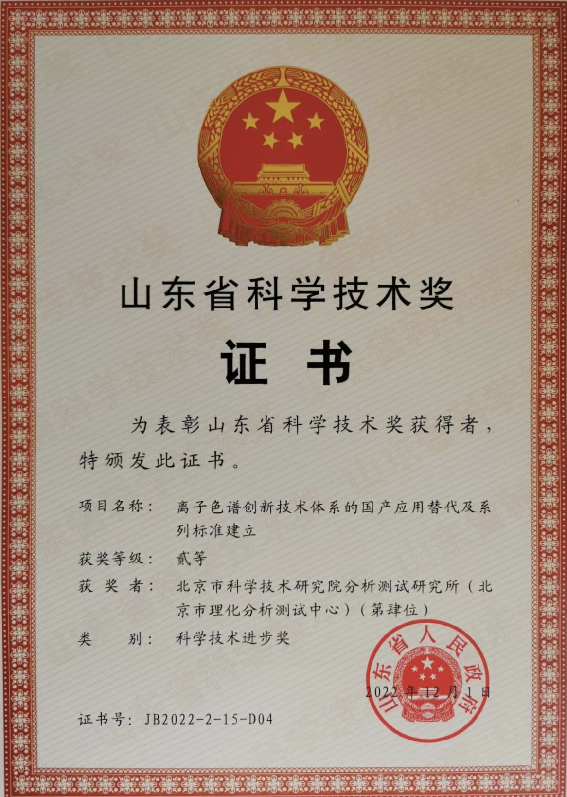 日前,山东省人民政府发布了《山东省人民政府关于2022年度山东省科学技术奖励的决定》。其中,幸运彩分析测试研究所作为第四申报单位,联合青岛海关技术中心等单位申报的《离子色谱创新技术体系的国产应用替代及系列标准建立》项目获得2022年度山东省科学技术奖二等奖。