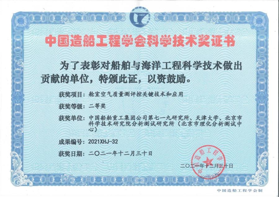 近日,分析测试所收到中国造船工程学会颁发的中国造船工程学会科学技术奖证书,由该所环境污染分析与控制课题组参与,中国船舶集团公司第七一研究所牵头、与天津大学联合完成的 “舱室空气质量测评控关键技术和应用”获得2021年度中国造船工程学会科学技术二等奖(成果编号2021XH-32)。