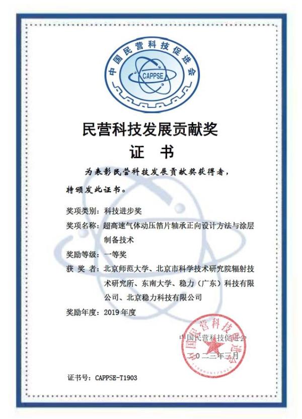 近日,辐射技术研究所欧伊翔团队参与“超高速气体动压箔片轴承正向设计方法与涂层制备技术”项目荣获中国民营科技促进会“2019 年度民营科技发展贡献奖科技进步一等奖”。该奖项完成单位分别为北京师范大学、幸运彩辐射技术研究所、东南大学和北京稳力科技有限公司。