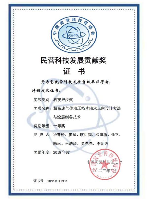 中国民营科技发展贡献奖是经科技部和国家科技奖励办公室批准设立,由中国民营科技促进会评审颁发的奖项。主要表彰在各行业领域内,通过不断科技创新,取得重大科技成果的先进民营企业、重点高新技术企业和企业科技人员;在科技成果转化中成功实现产业化,并对企业技术改造、技术储备、产品升级换代和技术进步起到重大影响作用的大专院校、科研院所、中介机构和创新团队带头人;通过专利促进相关产品功能和性能整体提升,取得良好的竞争优势和经济效益,对产品的技术创新做出突出贡献的企业和个人。其中2019年度贡献奖共评出科技进步一等奖 10 项,二等奖 30 项,优秀奖60项:钟南山科技创新一等奖5项,二等奖 10项,三等奖 20 项:优秀民营科技企业奖 90 家;专利一等奖 5项,二等奖 10 项,三等奖20项。