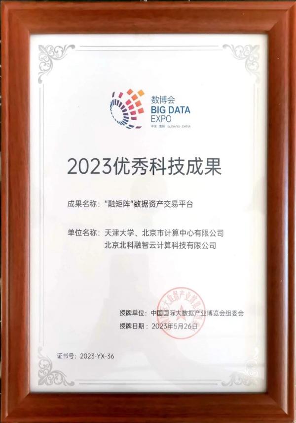 5月26日,中国国际大数据产业博览会(简称数博会)在贵州省贵阳市顺利召开。其中,在2023年优秀科技成果发布会上,北京市计算中心有限公司、天津大学、北京北科融智云计算科技有限公司(简称北科融智)联合报送的“融矩阵”数据资产交易平台荣获“优秀科技成果奖”。