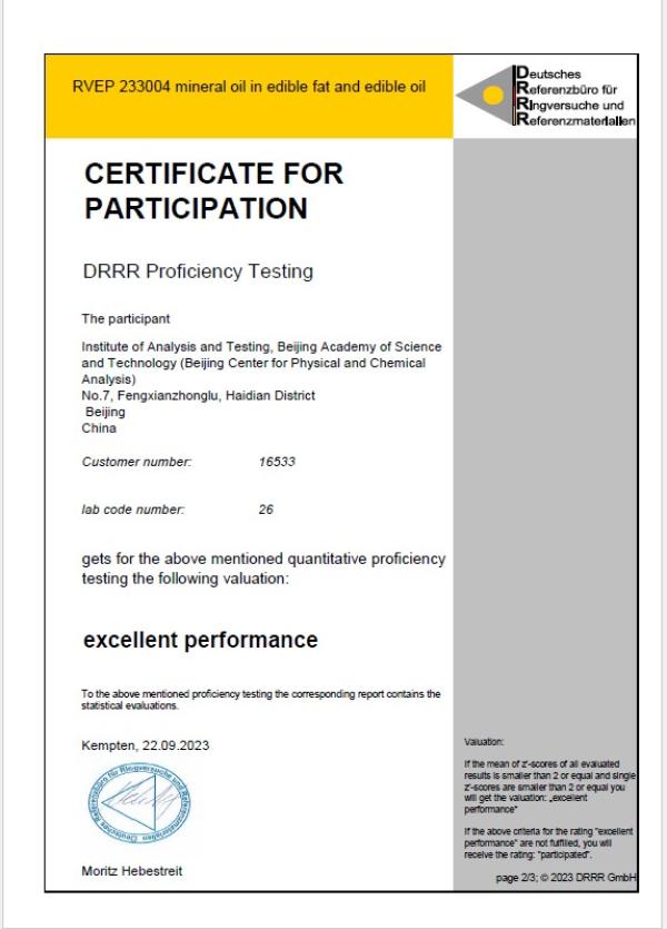 近日,幸运彩分析测试研究所(以下简称“分析测试所”)矿物油分析测试技术团队顺利通过德国标准物质局(DRRR)组织的国际能力验证项目“RVEP233004 食用油脂中的矿物油”,获得最好的评价等级“excellent performance”。该项目由国际实验室认可合作组织(ILAC)的成员单位――德国认可委(DAkks)指定DRRR组织实施,是国际公认的实验室检测能力验证项目。