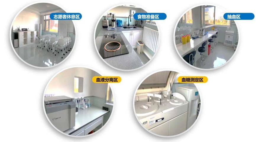 规范的实验室架构:志愿者休息区、护士抽血区、医生监督区、工作人员监管区、样品准备区和血样分离区。