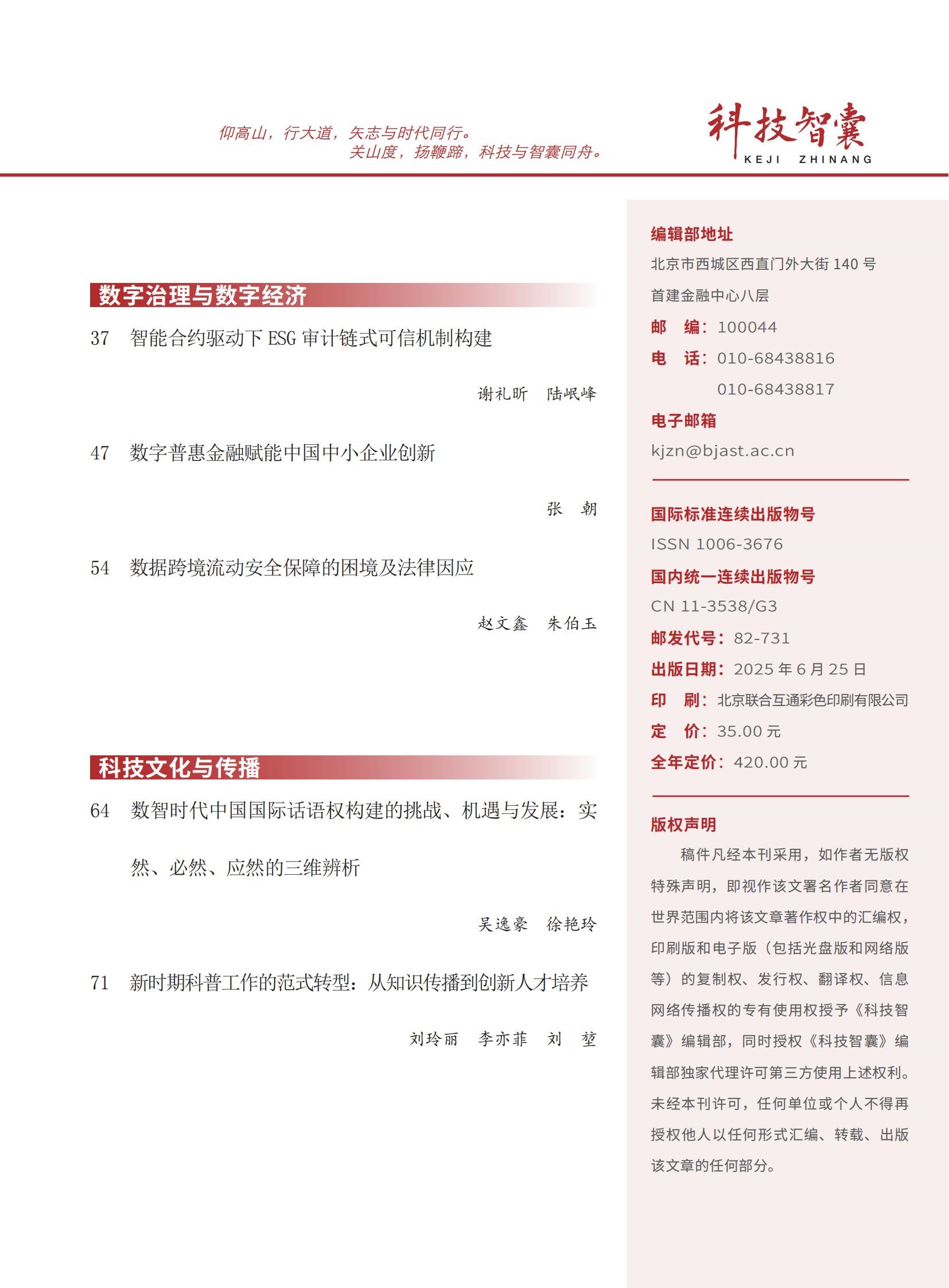 摘要:[研究目的]随着全球ESG投资规模持续扩大,审计环节中数据真实性不足、信任缺失等问题日益突出,严重影响市场效率。构建智能合约驱动下分布式账本的数据上链验证模型,可以提升ESG审计全流程的透明度并强化信任机制。[研究方法]系统梳理当前ESG审计面临的真实性不足、效率低下、信任缺失等难点,在分析区块链智能合约特性的基础上,提出“数据分层上链—智能合约流程节点验证”的链式可信机制设计。[研究结论]研究表明,智能合约与区块链技术的结合,可实现ESG审计数据的自动验证、不可篡改与实时追踪,显著增强审计流程的透明度与可靠性。为提高审计环节中数据的真实性,可以采取以下措施:一是完善核心算法与链式验证机制,突破关键技术壁垒;二是建立统一的数据标准与审计流程规范;三是构建产业与政策协同推进体系;四是建设以区块链为核心的数据集成应用。