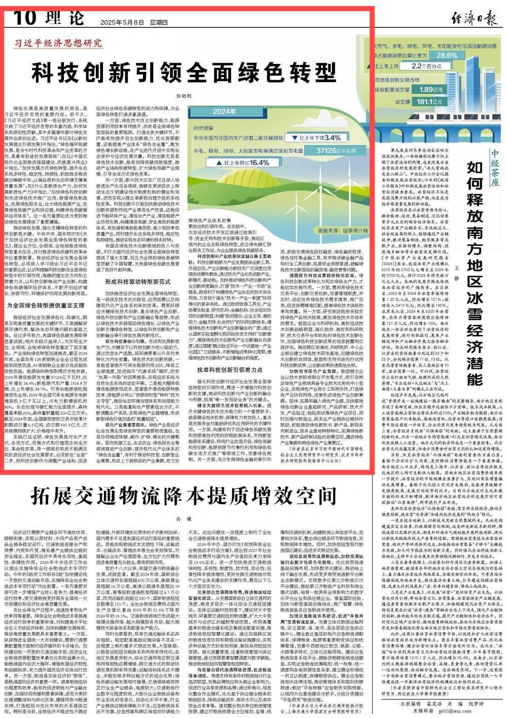 一方面,绿色技术自主创新能力、能源资源利用效率有待提升,依然是全面绿色转型面临的重要瓶颈。打通此类关键环节,不仅能有效提升自主创新能力、优化资源配置,还能提高产业体系“绿色含金量”,激发绿色增长新动能,在产业迭代升级中实现生态保护与经济发展双赢。科技创新尤其是绿色技术创新,能有效降低碳排放强度,推动产业结构低碳转型、扩大绿色低碳产业规模、引导生活方式绿色变革。