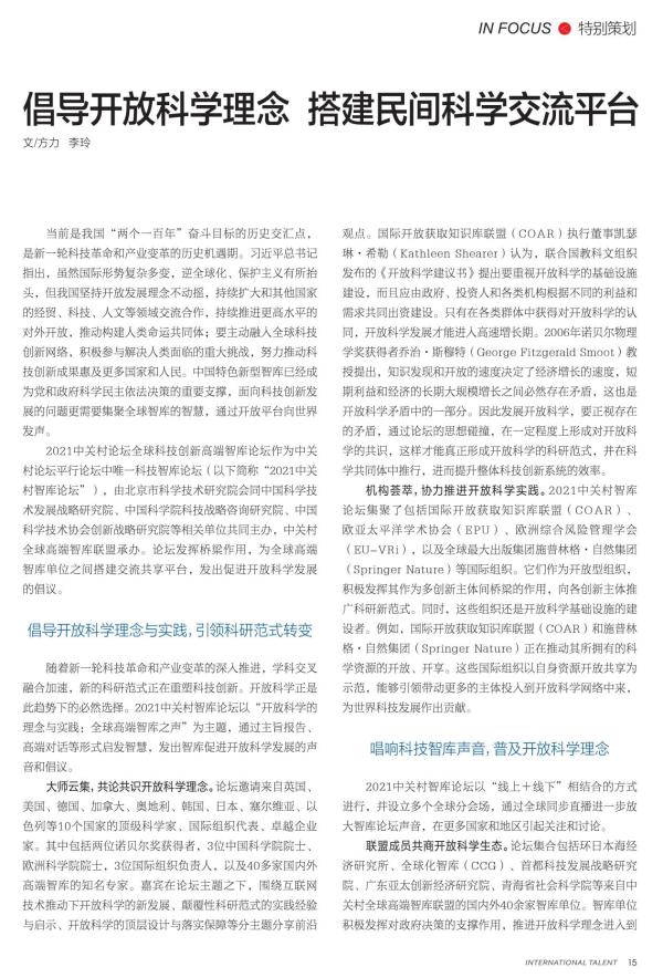 《国际人才交流》杂志围绕“开放科学”主题对北科院邀约组稿,并在特别策划栏目刊发了2021年全球科技创新高端智库论坛(以下简称智库论坛)的会议成果。稿件包含北科院党组书记方力、2013年诺贝尔化学奖获得者迈克尔·莱维特、2006年诺贝尔物理学奖获得者乔治·斯穆特、中国科学院院士刘忠范、施普林格·自然集团中华区总裁汤恩平、国际开放获取知识库联盟执行董事凯瑟琳·希勒的高端学术成果,对中关村全球高端智库联盟(以下简称智库联盟)及搭建开放科学交流平台进行了全面解读,全文近20000字。