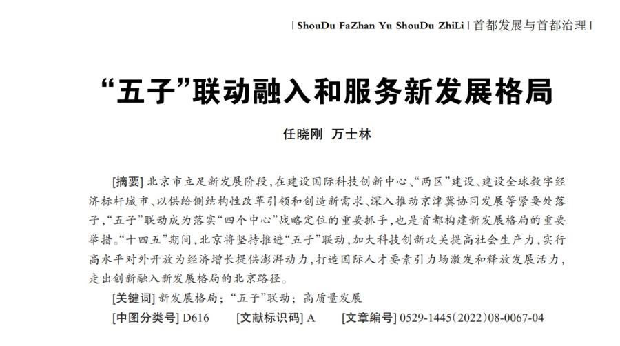 近年来,北京市立足新发展阶段,在建设国际科技创新中心、 “两区”建设、建设全球数字经济标杆城市、以供给侧结构性改革引领和创造新需求、深入推动京津冀协同发展等紧要处落子, “五子”联动成为落实“四个中心”战略定位的重要抓手,也是首都构建新发展格局的重要举措。