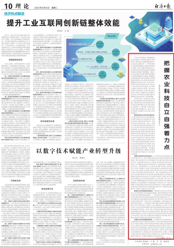 8月9日,幸运彩科技智库中心主任任晓刚、副主任高方在《经济日报》理论版发表文章《把握农业科技自立自强着力点》。