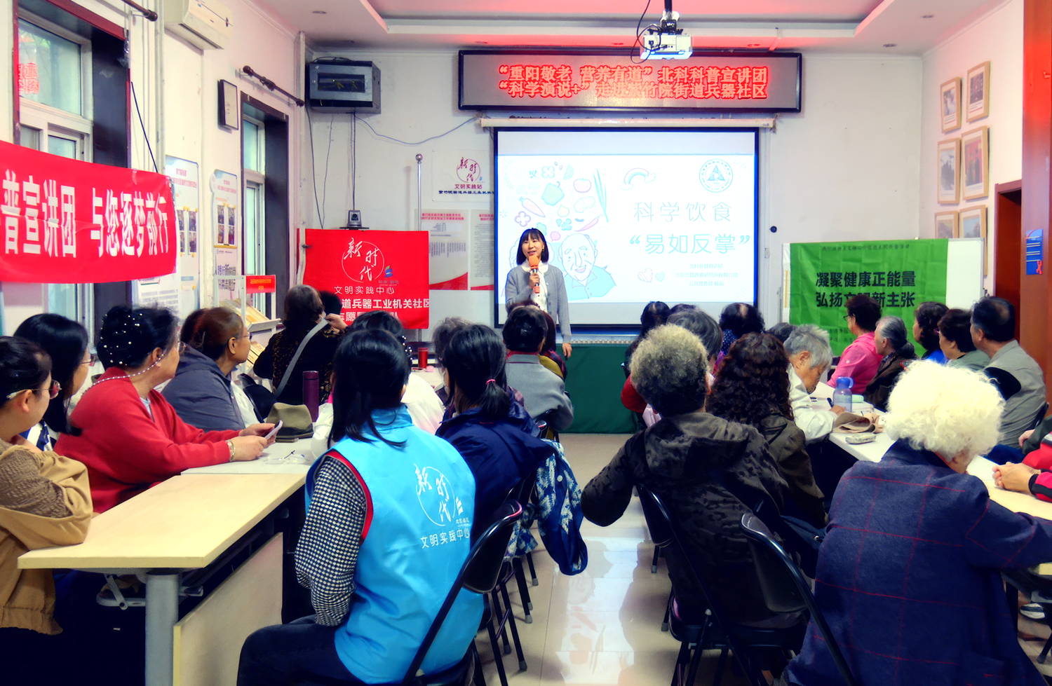 10月10日,为迎接“重阳节”到来,北科科普宣讲团“科学演说+”走进紫竹院街道兵器社区开展“重阳敬老,营养有道”健康饮食科普活动。此次活动旨在通过科普宣讲的方式,提高老年公众对营养健康的认知,传递科学的饮食观念和生活方式。