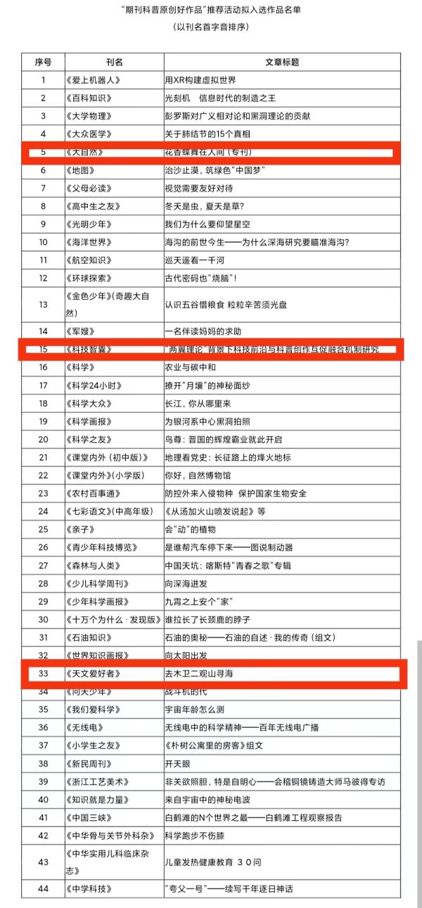 “期刊科普原创好作品”推荐活动入选作品名单