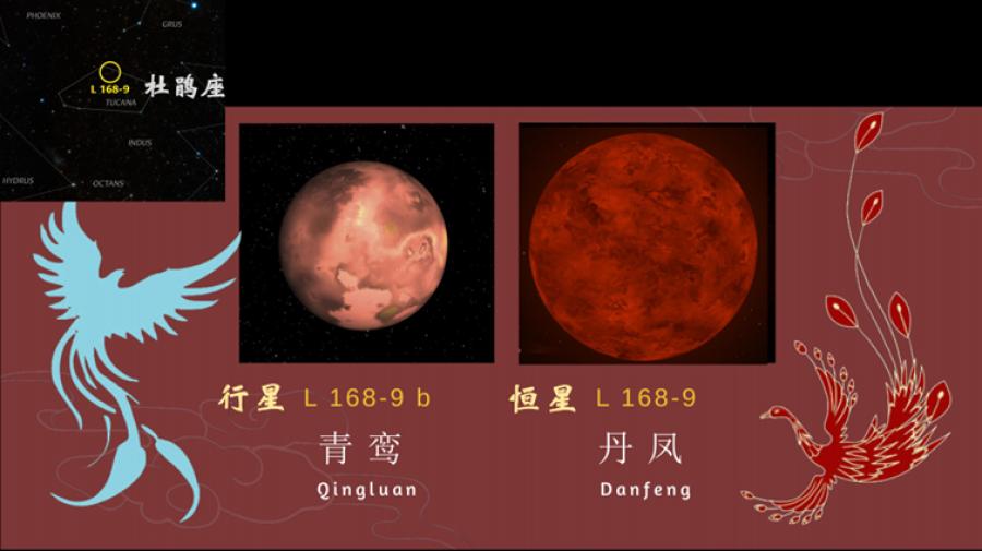 在发布会上,天文馆馆长、中国天文学会普及工作委员会主任王晓锋教授为“丹凤(Danfeng)”星和“青鸾(Qingluan)”星的命名牌揭幕,并介绍了这两个充满东方神韵的名称,展望了后续的科学普及工作。母恒星L 168-9是一颗红矮星,被命名为“丹凤”(Danfeng),指红色的凤凰,是中国古代神话传说中象征祥瑞的神鸟。围绕着它快速公转的行星命名为“青鸾”(Qingluan),是古代传说中属于凤凰一类的神鸟,也称作青鸟,它行动迅捷、奔波不息,也是传递爱情的使者。大家熟知的李商隐诗作——“青鸟殷勤为探看”,就留下了它的美名。丹凤与青鸾,这两个名称非常符合这个行星系统的性质,体现了天文学与中国传统文化的有机结合,也会让世界进一步了解中华文明的深厚底蕴。