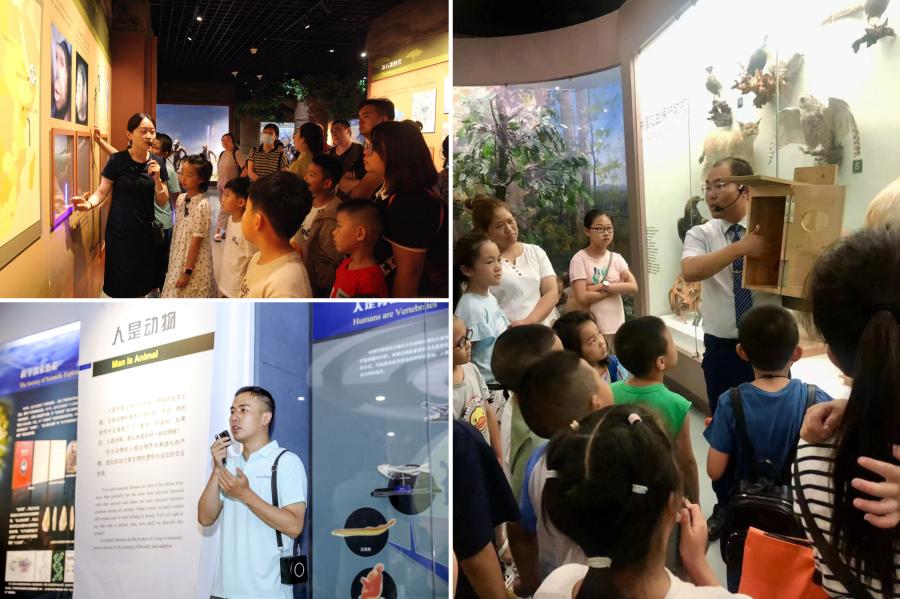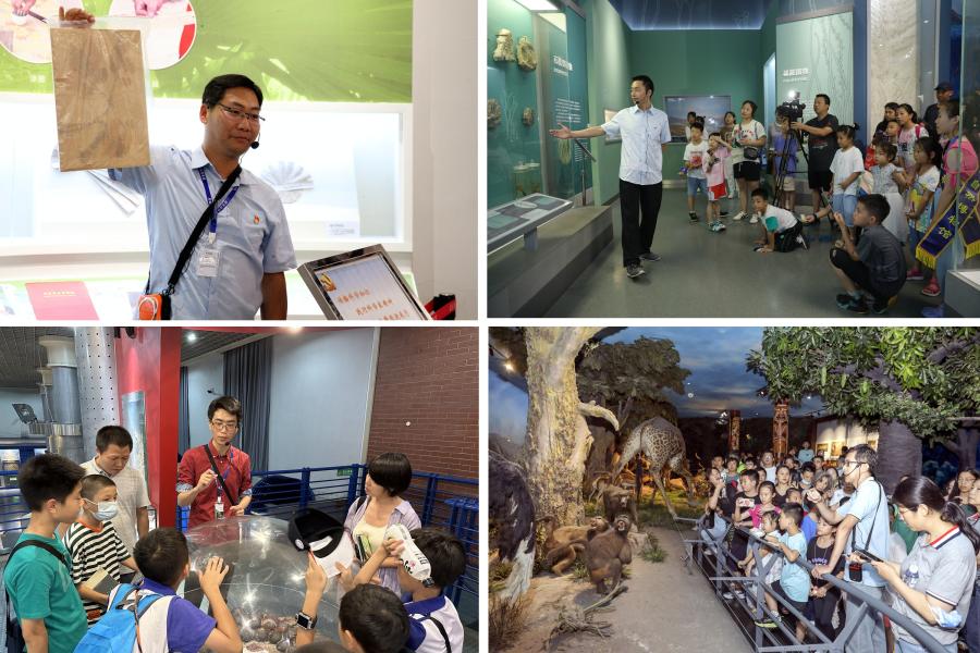 展厅里满脸好奇的孩子们手持博物护照,一边参观学习,一边填写答案。“博物护照”里包含了各展厅的知识问答,完成答题任务的孩子们在盖章台前排起长长的队,或是簇拥着负责盖章的小讲解员们询问正确答案。自然馆的科研人员、专业讲解员、志愿讲解员和小小讲解员们则承担了每晚为观众提供特色讲解的任务。尤其今年推出的特色讲解服务——科学研究人员精心准备的“标本零距离”,围绕展览和展品深层阐释科学知识或标本故事,与观众进行零距离互动答疑。每到活动举行的时段,科研人员经常被里三层外三层的观众围着,活动结束后仍然有观众围着科研人员继续发问,有的还会“借”标本留影。