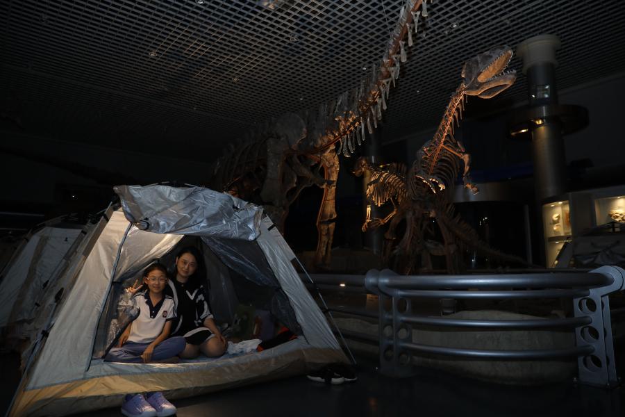 除了博物馆传统教育活动形式,今年的“夜宿”和话剧演出成为本年度“博物馆之夜”的热点和亮点。每周五、六晚举办的夜宿博物馆活动,为亲子家庭设计安排了展厅学习、自主探索、4D实景故事体验、科普实验探究等一系列极具趣味性的教育活动,最终环节是在古爬行动物展厅搭帐篷、与恐龙相伴度过惊险一夜。该项活动在“博物馆之夜”期间举办9场,接待211个家庭,有些参加活动的家庭来自外地,就是为了让孩子感受在恐龙陪伴下入睡的难得经历。而自然馆原创话剧《我是红彼得》则是首开先河,利用展厅的空间、建筑设施与展览,搭建起一个独一无二的舞台。话剧讲述了一只意外被人类捕获,又选择主动走进人类社会的黑猩猩的故事。演出中,红彼得回顾并演绎了一只黑猩猩如何在封闭、独孤、迷惘的处境中,一步步地变得与人类行为相似、相近,他的命运又如何因而一步步发生了变化。8月7日演出在线直播获得了30万人次的点击量。另外还有同期举办的自然科学4D影片展映,《地球生命大冒险》《巨龙王国》《寒武秘境》等影片也为夜间到场观众带来独特的观影体验。