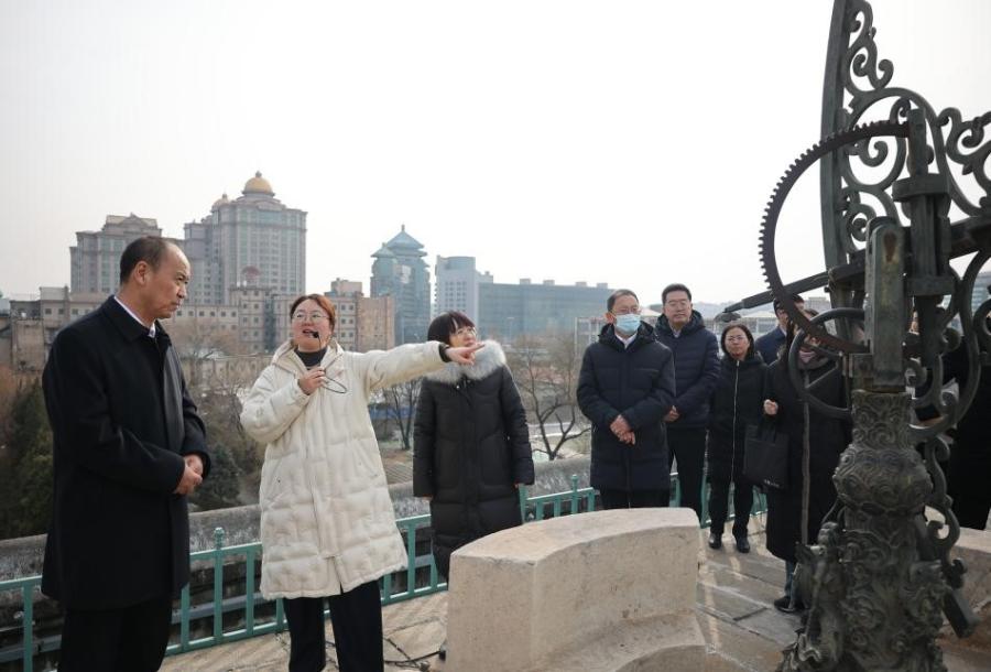 此后,调研人员来到古观象台南院,了解院落现状并提出发展的建议。最后,大家登上古观象台台顶,纵览古台全貌,参观清朝时期建造的赤道经纬仪、黄道经纬仪、地平经仪、地平经纬仪、象限仪、纪限仪、天体仪、玑衡抚辰仪等8台天文仪器。