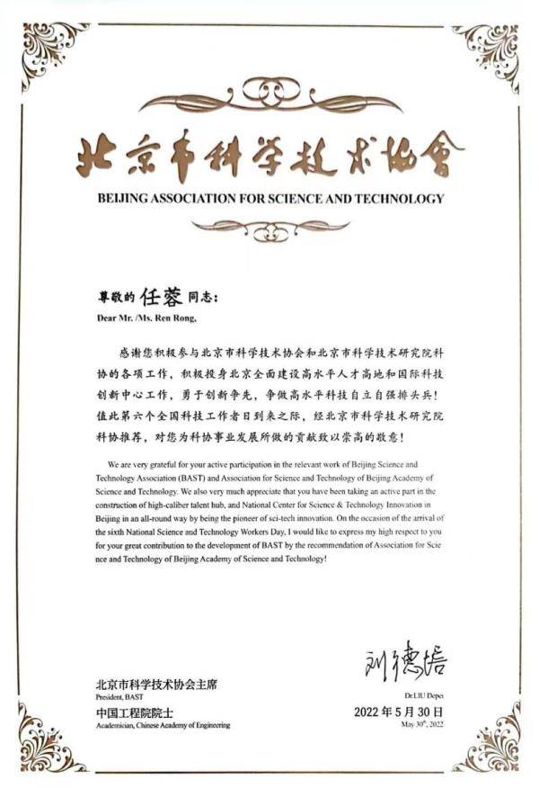 任蓉连续多年被单位评为“优秀职工”。多年来,积极参与北京市重点工作任务“两区”“三平台”建设工作,包括中国国际服务贸易交易会系列活动,中关村论坛相关高端智库论坛与国际技术交易大会系列活动与北京“两区”全球超链接系列推介活动等;积极参加中国科协开展的各类活动,促进“科创中国”发展,2021年至2022年连续两年成功申报“科创中国”幸运彩专业科技服务团,并组织推进相关工作;积极参与北京国际科技创新中心建设,落实京津冀区域协同战略,搭建国际与区域产学研协同平台,连续多年推进京津冀科研院所联盟相关工作,创新开展联盟大讲堂、优秀成果选拔赛、精准对接等形式多样的多场活动,促成多项国际与京津冀区域合作。