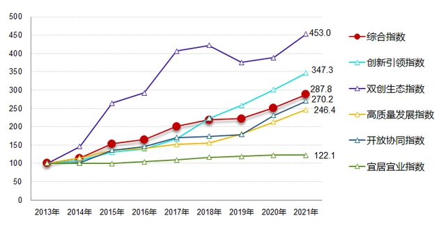 研究显示,中关村指数稳步提升,2021年达到287.8,较上年提升36.5,是2013年基期的2.9倍。在中关村指数2022五个一级指数中,创新引领指数快速上升,为347.3;双创生态指数提升明显,为453.0;开放协同指数和高质量发展指数均较快增长,分别达270.2、246.4;宜居宜业指数相对平稳,为122.1。