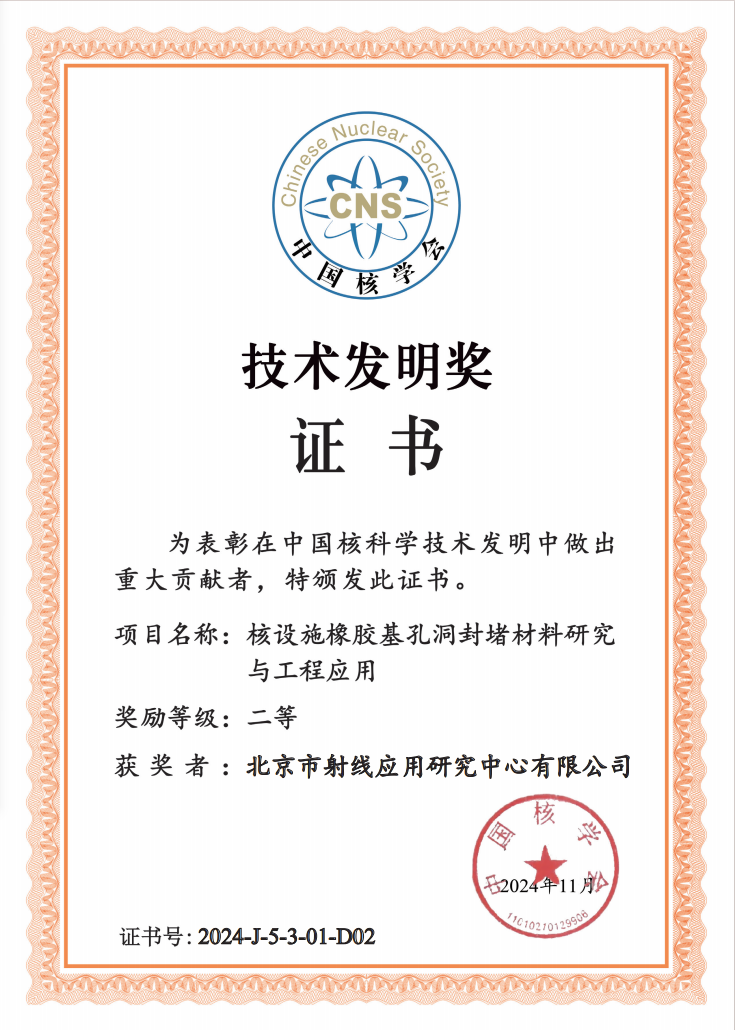 11月27日,中国核学会公布2024年中国核学会科学技术奖获奖名单。北京市射线应用研究中心有限公司(以下简称“射线中心”)作为第二申报单位,联合中国核电工程公司,申报的《核设施橡胶基孔洞封堵材料研究与工程应用》项目获得2024年度中国核学会技术发明二等奖。