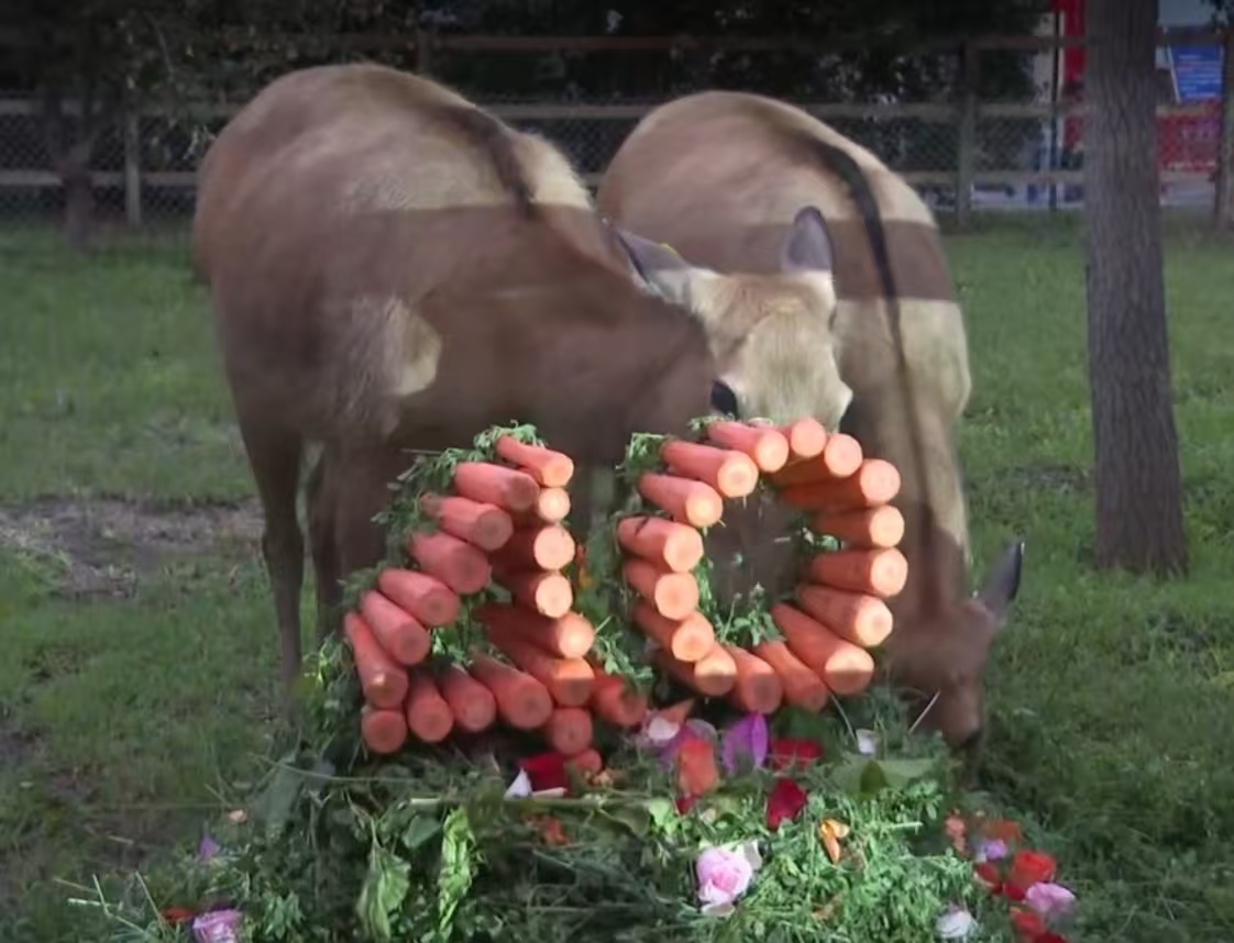 备受喜爱的明星麋鹿现身活动现场,工作人员精心准备以苜蓿为主料的特制“生日蛋糕”。 观众参与为麋鹿回归庆生!