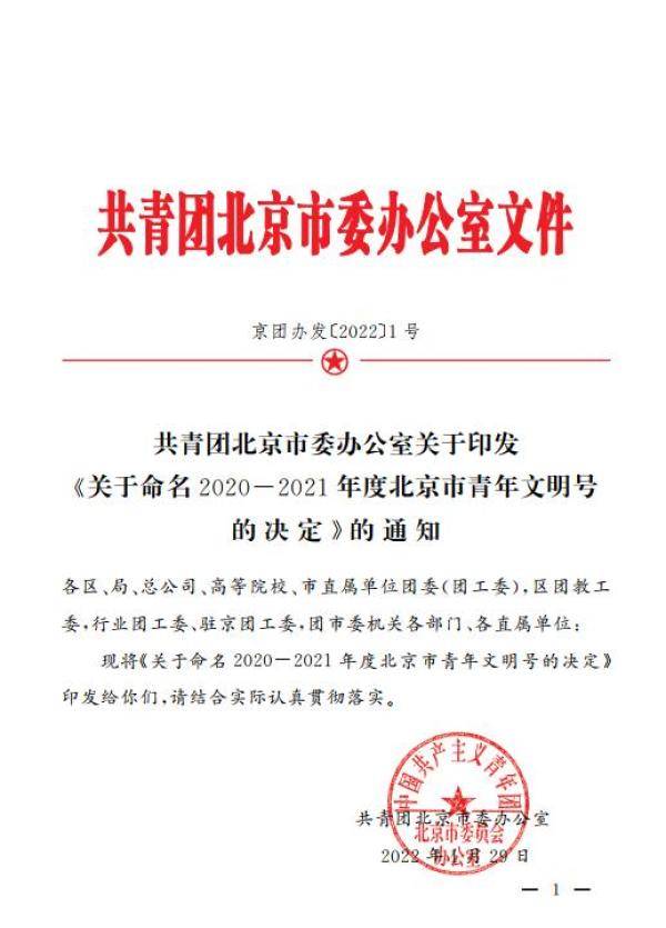 共青团北京市委办公室关于任命青年文明号的通知