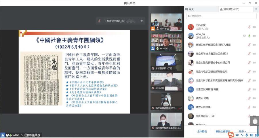 加强理论武装,开展组织化专题学习。北科院团委联合北京城市学院团委于4月29日上午共同开展“喜迎二十大、深学青运史、永远跟党走”专题学习,特邀中央团校团中央青运史档案馆胡献忠馆长作“百年团史重大事件述评”专题报告,近300名团员青年在线参与学习。通过胡献忠馆长的授课,使团员青年掌握青年运动史上重要会议、重要人物、重大事件的基本史实,清楚共青团组织和工作的发展脉络,牢记党的青年运动史的基本结论和根本立场,引导青年在学习党领导青年运动的光辉历程中增强永远跟党走的信心决心。