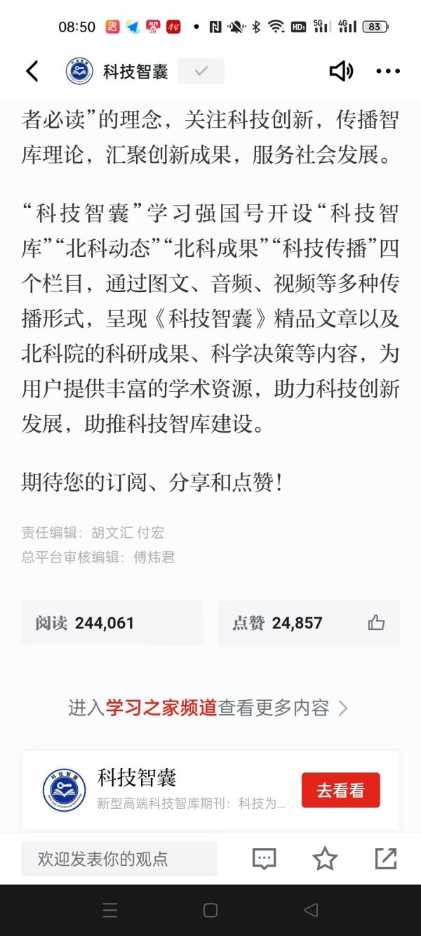 “科技智囊”学习强国号上线第一天,阅读总量已超45万,其中单篇阅读最高超过24万,受到学习强国用户广泛关注。同时,科技智库中心将持续依托《科技智囊》杂志、科技智囊公众号、北科智库公众号以及北科院里优质资源,形成传播合力,让更多业界人士和读者转载、订阅!