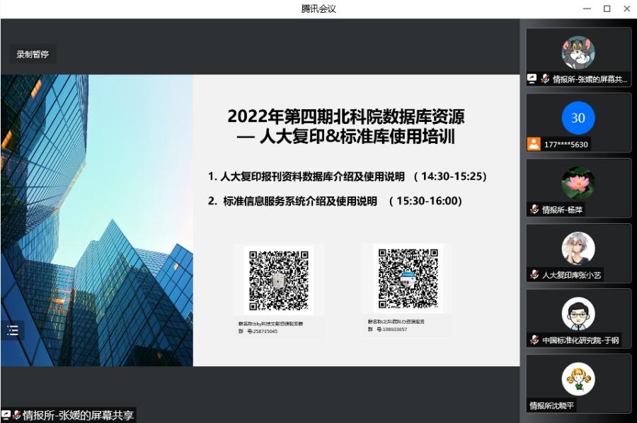 培训特邀人大数媒市场经理张小艺老师及中国标准化研究院信息所技术部于钢主任,分别对人大复印报刊资料和标准信息服务系统两个数据资源进行了详细深入的讲解和演示。帮助科研人员及时掌握选题分析、转载查询及系统中的标准数量、类型、检索方式、筛选规则等功能运用。