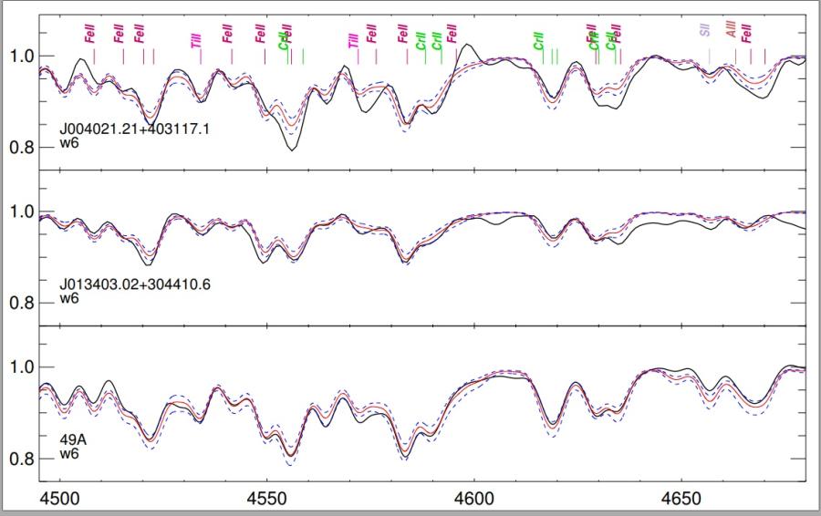 利用中国郭守敬巡天望远镜(LAMOST)提供的海量光谱数据,北京天文馆科学研究部刘成副研究员与国内外合作者从LAMOST数据库中严格地选取了属于仙女座旋涡星系(M31)和大三角旋涡星系(M33)的蓝超巨星样本。基于最新的恒星大气模型和方法,通过精细地分析蓝超巨星的光谱获得了每一颗恒星的重要物理参量(见图2),包括有效温度、表面重力、金属丰度和质量等。在此基础上,团队分别研究了M31和M33盘上恒星金属丰度的分布,发现离星系中心越远金属丰度越低,而且在M33盘上恒星金属丰度的分布呈现出一定的非对称性。这对目前流行的inside-out星系演化模型是个强力的支持。M33盘上金属丰度的不对称性预示M33星系可能有一个更加复杂的演化历史。利用蓝超巨星类烛光标准测量距离的特性,研究人员分别测量了M31和M33到地球的最佳距离为797.995 kpc和968.278 kpc。该研究成果已经发表在著名SCI期刊《天体物理学研究》(The Astrophysical Journal)上,论文链接:https://iopscience.iop.org/article/10.3847/1538-4357/ac69cc。 (刘成)