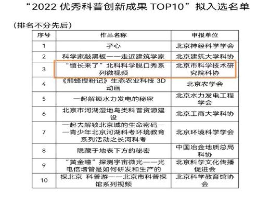 “2022优秀科普创新成果TOP10”,是市科协从40部入选优秀作品中评选出的10部。入围作品将被市科协推荐参加下一年度全国科普日、全国科技活动周、“典赞·科普中国”等活动。“2023年科学表演创演项目”,是北京科学中心面向各科普场馆、北京市中小学校、具备相关资质的社会机构等征集优秀科学表演创演作品,共5家单位入选。