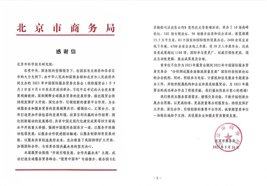 近日,我院收到北京市商务局发来的感谢信。信中指出,北科院不仅作为2023年中国国际服务贸易交易会“分析测试服务助推高质量发展”国际科技创新论坛的办会机构,同时,积极参与电信、计算机和信息服务专题展协办工作,并组织院属机构和企业参展亮相服贸会,为2023年服贸会的成功举办作出了积极贡献。同时,信中还表达了希望得到我院一如既往地支持,共促服务业和服务贸易繁荣发展的愿望。