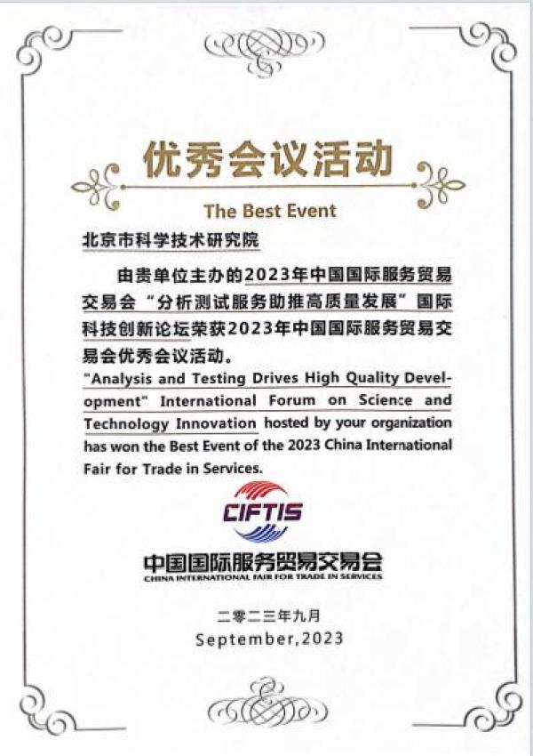 服贸会由商务部和北京市人民政府共同主办,是全球服务贸易领域规模最大的综合性展会。2023年9月4日,由我院和北京市两区办主办,院分析测试研究所、国际与区域合作中心等单位承办的“分析测试服务助推高质量发展”国际科技创新论坛在首钢园成功举办。该论坛以“科技驱动分析测试服务,创新引领高质量发展”为主题,共吸引了来自政府、高校、院所、企业、科技服务机构、投资服务机构等单位150余位代表线下参会,线上观看1500余人次,得到了多家知名媒体的支持和关注。论坛荣获了2023年中国国际服务贸易交易会优秀会议活动。